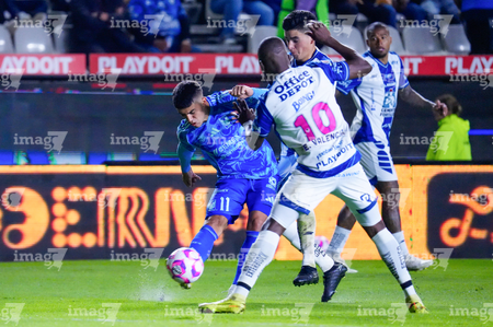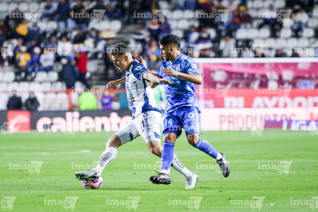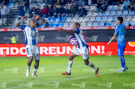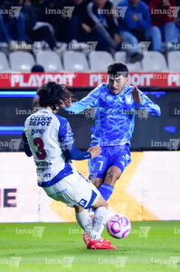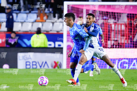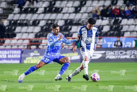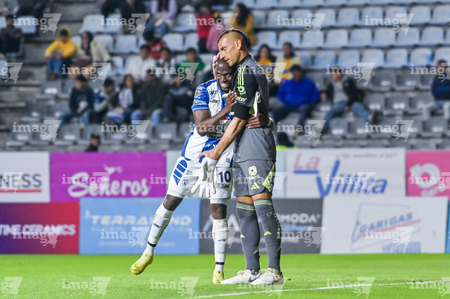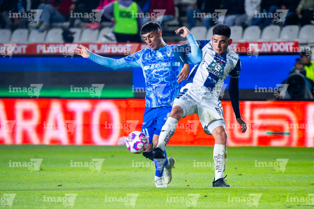 Pachuca, Hidalgo, 22 de octubre de 2025. Jesús Garza y Daniel Aceves, durante el partido correspondiente a la jornada 14 del torneo Apertura 2025 de la Liga BBVA MX, entre los Tuzos del Pachuca y los Tigres de la UANL, realizado en el estadio Hidalgo. Foto: Imago7/ Elizabeth Hernández