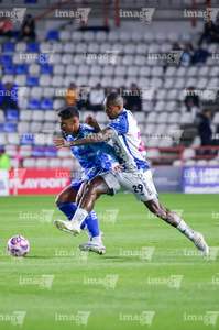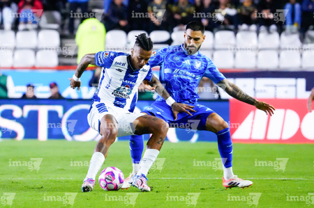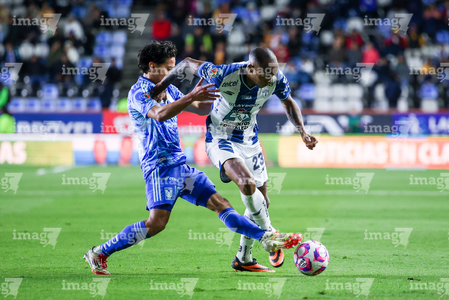 Pachuca, Hidalgo, 22 de octubre de 2025. Jhonder Cádiz y Juan Sánchez, durante el partido correspondiente a la jornada 14 del torneo Apertura 2025 de la Liga BBVA MX, entre los Tuzos del Pachuca y los Tigres de la UANL, realizado en el estadio Hidalgo. Foto: Imago7/ Jacqueline Pedraza