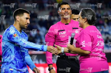 Pachuca, Hidalgo, 22 de octubre de 2025. Embajadora de la Campaña Rosa para la concientización del Cáncer de Mama y Carlos Moreno, durante el partido correspondiente a la jornada 14 del torneo Apertura 2025 de la Liga BBVA MX, entre los Tuzos del Pachuca y los Tigres de la UANL, realizado en el estadio Hidalgo. Foto: Imago7/ Jacqueline Pedraza