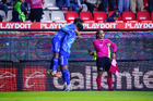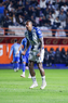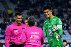 Pachuca, Hidalgo, 22 de octubre de 2025. Nahuel Guzmán y Robert Kenedy, durante el partido correspondiente a la jornada 14 del torneo Apertura 2025 de la Liga BBVA MX, entre los Tuzos del Pachuca y los Tigres de la UANL, realizado en el estadio Hidalgo. Foto: Imago7/ Elizabeth Hernández