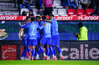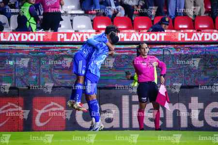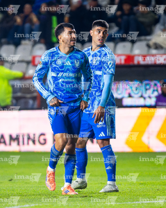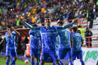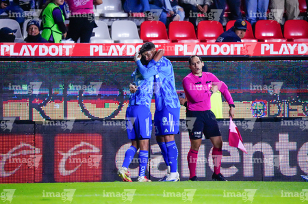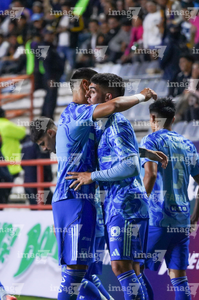 Pachuca, Hidalgo, 22 de octubre de 2025. Jugadores de Tigres en festejo de gol, durante el partido correspondiente a la jornada 14 del torneo Apertura 2025 de la Liga BBVA MX, entre los Tuzos del Pachuca y los Tigres de la UANL, realizado en el estadio Hidalgo. Foto: Imago7/ Jacqueline Pedraza