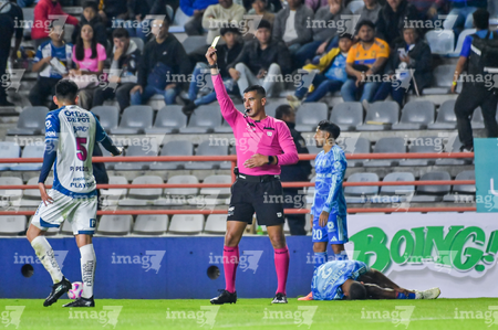 Pachuca, Hidalgo, 22 de octubre de 2025. Abraham de Jesús Quirarte Contreras, árbitro central, muestra tarjeta amarilla de amonestación para Pedro Pedraza, durante el partido correspondiente a la jornada 14 del torneo Apertura 2025 de la Liga BBVA MX, entre los Tuzos del Pachuca y los Tigres de la UANL, realizado en el estadio Hidalgo. Foto: Imago7/ Mauricio Ruiz