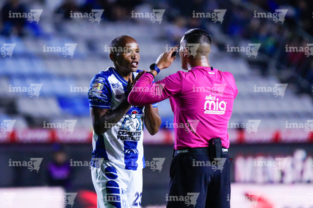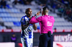 Pachuca, Hidalgo, 22 de octubre de 2025. Luis Quiñones y Abraham de Jesús Quirarte, árbitro central, durante el partido correspondiente a la jornada 14 del torneo Apertura 2025 de la Liga BBVA MX, entre los Tuzos del Pachuca y los Tigres de la UANL, realizado en el estadio Hidalgo. Foto: Imago7/ Jacqueline Pedraza