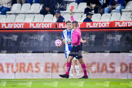 Pachuca, Hidalgo, 22 de octubre de 2025. Abraham de Jesús Quirarte, árbitro central muestra tarjeta roja de expulsión a Oussama Idrissi, durante el partido correspondiente a la jornada 14 del torneo Apertura 2025 de la Liga BBVA MX, entre los Tuzos del Pachuca y los Tigres de la UANL, realizado en el estadio Hidalgo. Foto: Imago7/ Diego Padilla