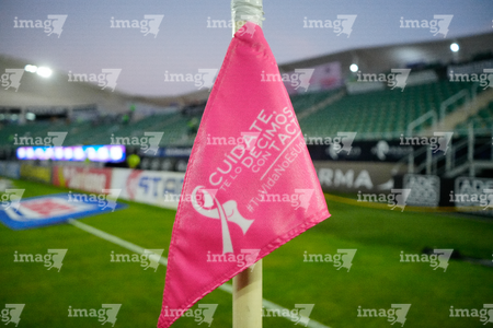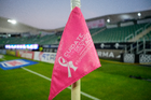 Mazatlán, Sinaloa, 24 de octubre de 2025. Banderin de tiro de esquina de la Campaña Rosa para la concientización del Cáncer de Mama, durante el partido correspondiente a la jornada 15 del torneo Apertura 2025 de la Liga BBVA MX, entre los Cañoneros del Mazatlán FC y las Águilas del América, realizado en el estadio El Encanto. Foto: Imago7/ Diego Padilla
