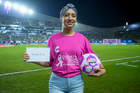 Mazatlán, Sinaloa, 24 de octubre de 2025. Embajadora de la Campaña Rosa para la concientización del Cáncer de Mama, durante el partido correspondiente a la jornada 15 del torneo Apertura 2025 de la Liga BBVA MX, entre los Cañoneros del Mazatlán FC y las Águilas del América, realizado en el estadio El Encanto. Foto: Imago7/ Diego Padilla