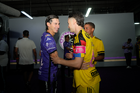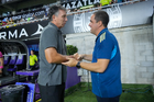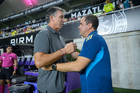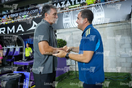 Mazatlán, Sinaloa, 24 de octubre de 2025. Robert Dante Siboldi, director técnico y Andre Jardine, director técnico, durante el partido correspondiente a la jornada 15 del torneo Apertura 2025 de la Liga BBVA MX, entre los Cañoneros del Mazatlán FC y las Águilas del América, realizado en el estadio El Encanto. Foto: Imago7/ Diego Padilla