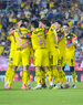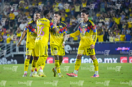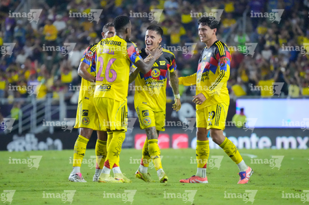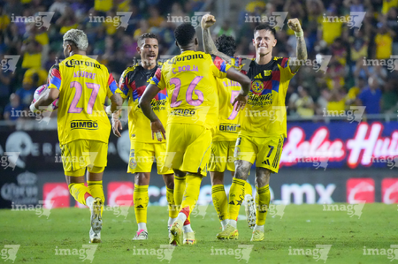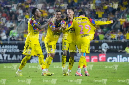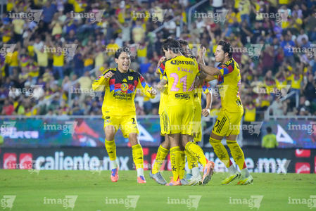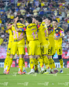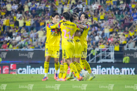 Mazatlán, Sinaloa, 24 de octubre de 2025. Jugadores del Club América en festejo de gol, durante el partido correspondiente a la jornada 15 del torneo Apertura 2025 de la Liga BBVA MX, entre los Cañoneros del Mazatlán FC y las Águilas del América, realizado en el estadio El Encanto. Foto: Imago7/ Diego Padilla