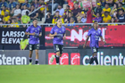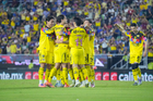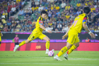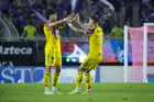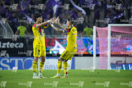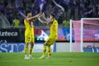 Mazatlán, Sinaloa, 24 de octubre de 2025. Kevin Álvarez y Brian Rodríguez en festejo de gol, durante el partido correspondiente a la jornada 15 del torneo Apertura 2025 de la Liga BBVA MX, entre los Cañoneros del Mazatlán FC y las Águilas del América, realizado en el estadio El Encanto. Foto: Imago7/ Diego Padilla
