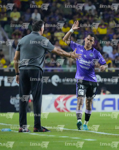 Mazatlán, Sinaloa, 24 de octubre de 2025. Robert Dante Siboldi, director técnico y Mauro Zaleta en festejo de gol, durante el partido correspondiente a la jornada 15 del torneo Apertura 2025 de la Liga BBVA MX, entre los Cañoneros del Mazatlán FC y las Águilas del América, realizado en el estadio El Encanto. Foto: Imago7/ Diego Padilla