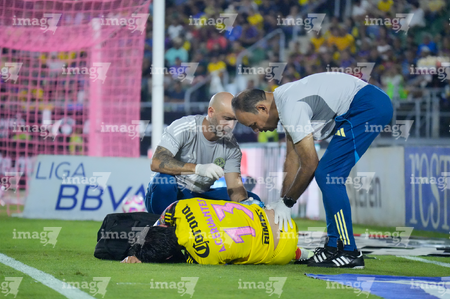 Mazatlán, Sinaloa, 24 de octubre de 2025. Alan Cervantes resultó lesionado, durante el partido correspondiente a la jornada 15 del torneo Apertura 2025 de la Liga BBVA MX, entre los Cañoneros del Mazatlán FC y las Águilas del América, realizado en el estadio El Encanto. Foto: Imago7/ Diego Padilla