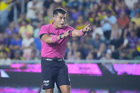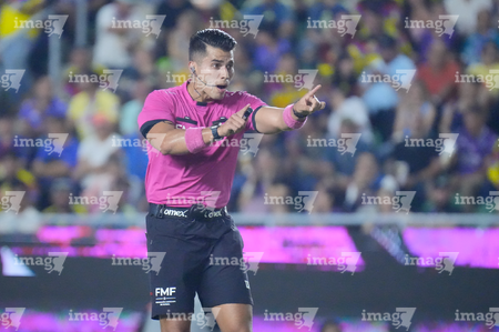 Mazatlán, Sinaloa, 24 de octubre de 2025. Guillermo Pacheco Larios, árbitro central, durante el partido correspondiente a la jornada 15 del torneo Apertura 2025 de la Liga BBVA MX, entre los Cañoneros del Mazatlán FC y las Águilas del América, realizado en el estadio El Encanto. Foto: Imago7/ Diego Padilla