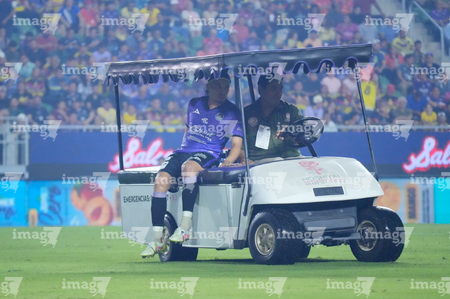 Mazatlán, Sinaloa, 24 de octubre de 2025. Bryan Colula resultó lesionado, durante el partido correspondiente a la jornada 15 del torneo Apertura 2025 de la Liga BBVA MX, entre los Cañoneros del Mazatlán FC y las Águilas del América, realizado en el estadio El Encanto. Foto: Imago7/ Diego Padilla