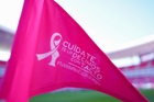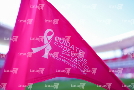 Zapopan, Jalisco, 25 de octubre de 2025. Banderin de tiro de esquina de la Campaña Rosa para la concientización del Cáncer de Mama, durante el partido correspondiente a la jornada 15 del torneo Apertura 2025 de la Liga BBVA MX, entre las Chivas Rayadas del Guadalajara y los Rojinegros del Atlas, realizado en el estadio Akron. Foto: Imago7/ Hugo Ramirez