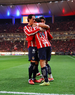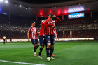 Zapopan, Jalisco, 25 de octubre de 2025. Teun Wilke, Armando González y José Castillo en festejo de gol, durante el partido correspondiente a la jornada 15 del torneo Apertura 2025 de la Liga BBVA MX, entre las Chivas Rayadas del Guadalajara y los Rojinegros del Atlas, realizado en el estadio Akron. Foto: Imago7/ Juan Carlos Cubeyro.