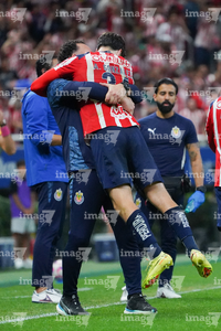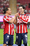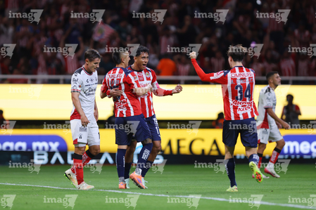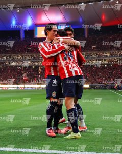 Zapopan, Jalisco, 25 de octubre de 2025. Roberto Alvarado "Piojo" y Luis Romo en festejo de gol, durante el partido correspondiente a la jornada 15 del torneo Apertura 2025 de la Liga BBVA MX, entre las Chivas Rayadas del Guadalajara y los Rojinegros del Atlas, realizado en el estadio Akron. Foto: Imago7/ Juan Carlos Cubeyro.
