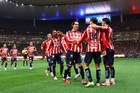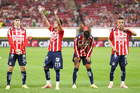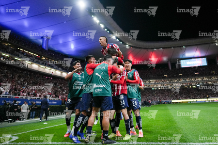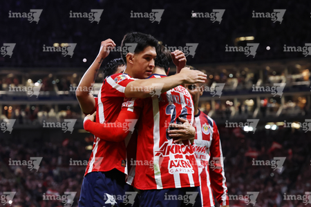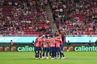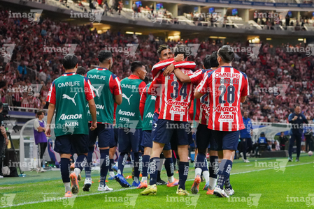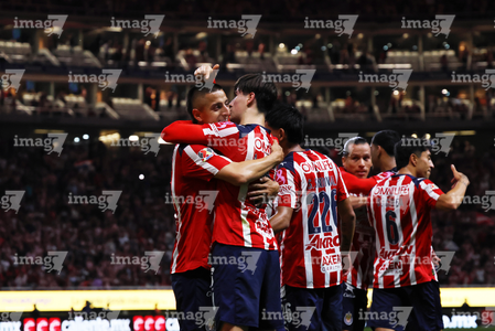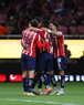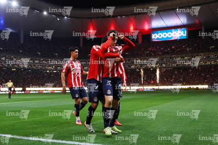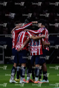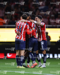 Zapopan, Jalisco, 25 de octubre de 2025. Jugadores de Chivas en festejo de gol, durante el partido correspondiente a la jornada 15 del torneo Apertura 2025 de la Liga BBVA MX, entre las Chivas Rayadas del Guadalajara y los Rojinegros del Atlas, realizado en el estadio Akron. Foto: Imago7/ Juan Carlos Cubeyro.