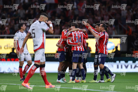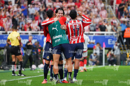 Zapopan, Jalisco, 25 de octubre de 2025. Jugadores de Chivas en festejo, durante el partido correspondiente a la jornada 15 del torneo Apertura 2025 de la Liga BBVA MX, entre las Chivas Rayadas del Guadalajara y los Rojinegros del Atlas, realizado en el estadio Akron. Foto: Imago7/ Hugo Ramirez