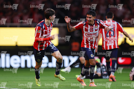 Zapopan, Jalisco, 25 de octubre de 2025. Armando González y Santiago Sandoval en festejo de gol, durante el partido correspondiente a la jornada 15 del torneo Apertura 2025 de la Liga BBVA MX, entre las Chivas Rayadas del Guadalajara y los Rojinegros del Atlas, realizado en el estadio Akron. Foto: Imago7/ Juan Carlos Cubeyro.