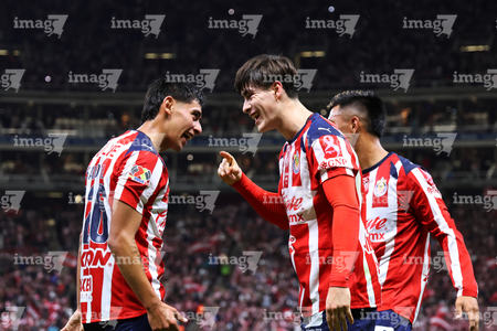 Zapopan, Jalisco, 25 de octubre de 2025. Santiago Sandoval y Armando González en festejo de gol, durante el partido correspondiente a la jornada 15 del torneo Apertura 2025 de la Liga BBVA MX, entre las Chivas Rayadas del Guadalajara y los Rojinegros del Atlas, realizado en el estadio Akron. Foto: Imago7/ Juan Carlos Cubeyro.