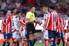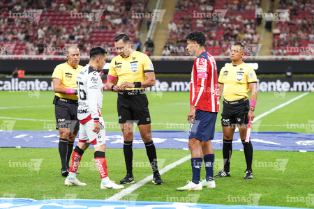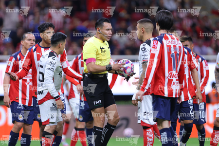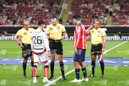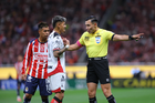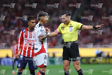 Zapopan, Jalisco, 25 de octubre de 2025. Diego González y Marco Antonio Ortiz, árbitro central, durante el partido correspondiente a la jornada 15 del torneo Apertura 2025 de la Liga BBVA MX, entre las Chivas Rayadas del Guadalajara y los Rojinegros del Atlas, realizado en el estadio Akron. Foto: Imago7/ Juan Carlos Cubeyro.