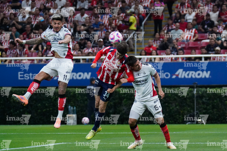 Zapopan, Jalisco, 25 de octubre de 2025. Sergio Hernández, Paulo Ramirez y Aldo Rocha, durante el partido correspondiente a la jornada 15 del torneo Apertura 2025 de la Liga BBVA MX, entre las Chivas Rayadas del Guadalajara y los Rojinegros del Atlas, realizado en el estadio Akron. Foto: Imago7/Andrés Sepúlveda