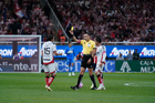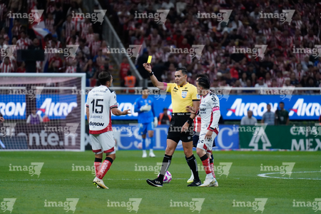 Zapopan, Jalisco, 25 de octubre de 2025. Marco Antonio Ortiz, árbitro central muestra tarjeta amarilla de amonestación a Paulo Ramirez, durante el partido correspondiente a la jornada 15 del torneo Apertura 2025 de la Liga BBVA MX, entre las Chivas Rayadas del Guadalajara y los Rojinegros del Atlas, realizado en el estadio Akron. Foto: Imago7/ Alejandro Lias