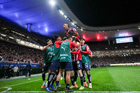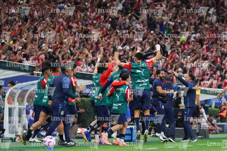 Zapopan, Jalisco, 25 de octubre de 2025. Jugadores suplentes de Chivas en festejo, durante el partido correspondiente a la jornada 15 del torneo Apertura 2025 de la Liga BBVA MX, entre las Chivas Rayadas del Guadalajara y los Rojinegros del Atlas, realizado en el estadio Akron. Foto: Imago7/ Alejandro Lias