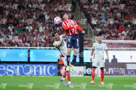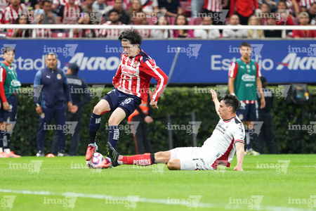 Zapopan, Jalisco, 25 de octubre de 2025. Diego González y Luis Romo, durante el partido correspondiente a la jornada 15 del torneo Apertura 2025 de la Liga BBVA MX, entre las Chivas Rayadas del Guadalajara y los Rojinegros del Atlas, realizado en el estadio Akron. Foto: Imago7/ Alejandro Lias