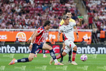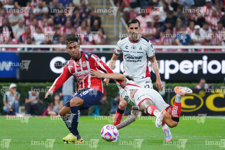 Zapopan, Jalisco, 25 de octubre de 2025. Roberto Alvarado "Piojo" y Adrián Mora, durante el partido correspondiente a la jornada 15 del torneo Apertura 2025 de la Liga BBVA MX, entre las Chivas Rayadas del Guadalajara y los Rojinegros del Atlas, realizado en el estadio Akron. Foto: Imago7/ Juan Carlos Cubeyro.