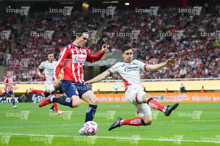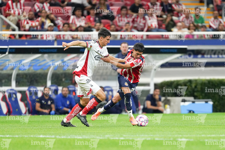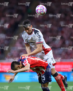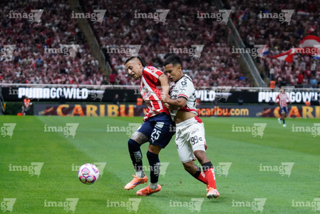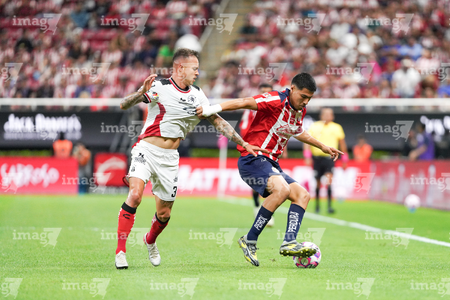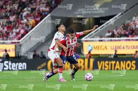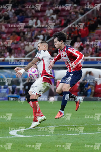 Zapopan, Jalisco, 25 de octubre de 2025. Gaddi Aguirre y Armando González, durante el partido correspondiente a la jornada 15 del torneo Apertura 2025 de la Liga BBVA MX, entre las Chivas Rayadas del Guadalajara y los Rojinegros del Atlas, realizado en el estadio Akron. Foto: Imago7/ Alejandro Lias