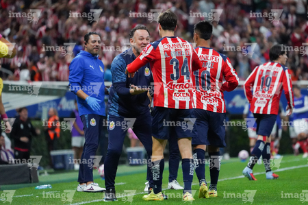 Zapopan, Jalisco, 25 de octubre de 2025. Gabriel Milito, director técnico y Armando González en festejo de gol, durante el partido correspondiente a la jornada 15 del torneo Apertura 2025 de la Liga BBVA MX, entre las Chivas Rayadas del Guadalajara y los Rojinegros del Atlas, realizado en el estadio Akron. Foto: Imago7/ Alejandro Lias