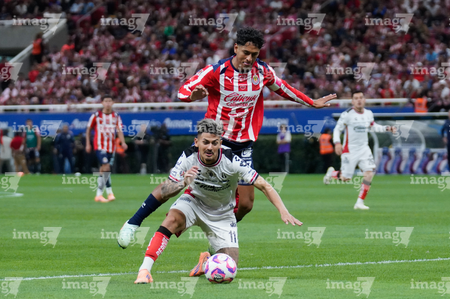Zapopan, Jalisco, 25 de octubre de 2025. Uros Durdevic y Diego Campillo, durante el partido correspondiente a la jornada 15 del torneo Apertura 2025 de la Liga BBVA MX, entre las Chivas Rayadas del Guadalajara y los Rojinegros del Atlas, realizado en el estadio Akron. Foto: Imago7/ Alejandro Lias