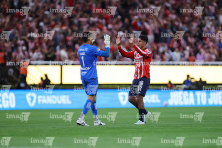Zapopan, Jalisco, 25 de octubre de 2025. Raúl Rangel y Luis Romo en festejo, durante el partido correspondiente a la jornada 15 del torneo Apertura 2025 de la Liga BBVA MX, entre las Chivas Rayadas del Guadalajara y los Rojinegros del Atlas, realizado en el estadio Akron. Foto: Imago7/ Juan Carlos Cubeyro.