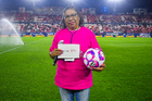 San Luis Potosí, San Luis Potosí, 26 de octubre de 2025. Embajadora de la Campaña Rosa para la concientización del Cáncer de Mama, durante el partido correspondiente a la jornada 15 del torneo Apertura 2025 de la Liga BBVA MX, entre el Atlético San Luis y los Rayos del Necaxa, realizado en el estadio Alfonso Lastras. Foto: Imago7/ Olimpia Puga