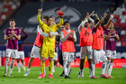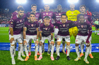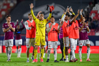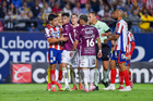 San Luis Potosí, San Luis Potosí, 26 de octubre de 2025. Jugadores de Necaxa en festejo, durante el partido correspondiente a la jornada 15 del torneo Apertura 2025 de la Liga BBVA MX, entre el Atlético San Luis y los Rayos del Necaxa, realizado en el estadio Alfonso Lastras. Foto: Imago7/ Hugo Martinez