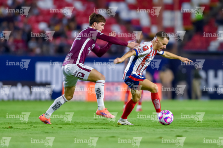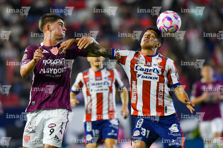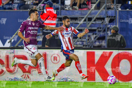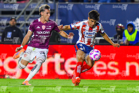 San Luis Potosí, San Luis Potosí, 26 de octubre de 2025. Tomas Badaloni y Eduardo Águila, durante el partido correspondiente a la jornada 15 del torneo Apertura 2025 de la Liga BBVA MX, entre el Atlético San Luis y los Rayos del Necaxa, realizado en el estadio Alfonso Lastras. Foto: Imago7/ Olimpia Puga