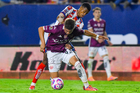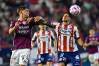 San Luis Potosí, San Luis Potosí, 26 de octubre de 2025. Franco Rossano y Román Torres, durante el partido correspondiente a la jornada 15 del torneo Apertura 2025 de la Liga BBVA MX, entre el Atlético San Luis y los Rayos del Necaxa, realizado en el estadio Alfonso Lastras. Foto: Imago7/ Olimpia Puga