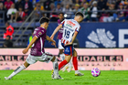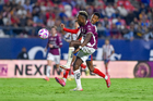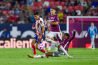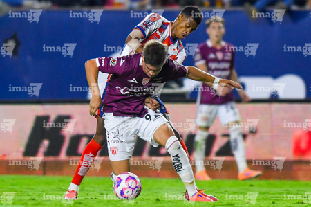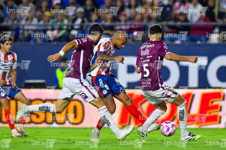 San Luis Potosí, San Luis Potosí, 26 de octubre de 2025. Agustin Palavecino y Sebastien Salles-lamonge, durante el partido correspondiente a la jornada 15 del torneo Apertura 2025 de la Liga BBVA MX, entre el Atlético San Luis y los Rayos del Necaxa, realizado en el estadio Alfonso Lastras. Foto: Imago7/ Hugo Martinez