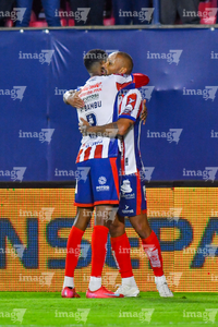 San Luis Potosí, San Luis Potosí, 26 de octubre de 2025. Tomas Badaloni y Emilio Lara en festejo de gol, durante el partido correspondiente a la jornada 15 del torneo Apertura 2025 de la Liga BBVA MX, entre el Atlético San Luis y los Rayos del Necaxa, realizado en el estadio Alfonso Lastras. Foto: Imago7/ Hugo Martinez