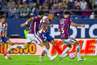 San Luis Potosí, San Luis Potosí, 26 de octubre de 2025. Román Torres y Cristian Calderón "Chicote" en conato de bronca, durante el partido correspondiente a la jornada 15 del torneo Apertura 2025 de la Liga BBVA MX, entre el Atlético San Luis y los Rayos del Necaxa, realizado en el estadio Alfonso Lastras. Foto: Imago7/ Hugo Martinez