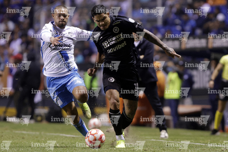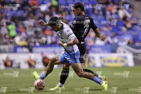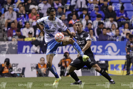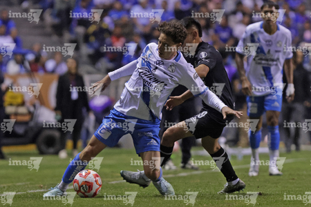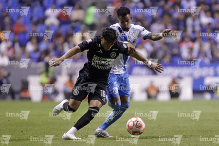 Puebla, Puebla, 31 de octubre de 2025. Rodrigo Pachuca y Gabriel Fernandez, durante el partido correspondiente a la jornada 16 del torneo Apertura 2025 de la Liga BBVA MX, entre el Club Puebla y la Máquina Celeste del Cruz Azul, realizado en el estadio Cuauhtémoc. Foto: Imago7/ Mireya Novo