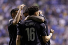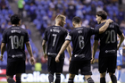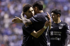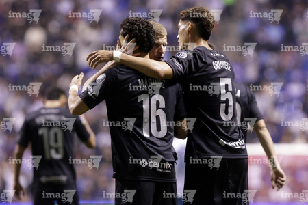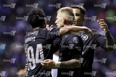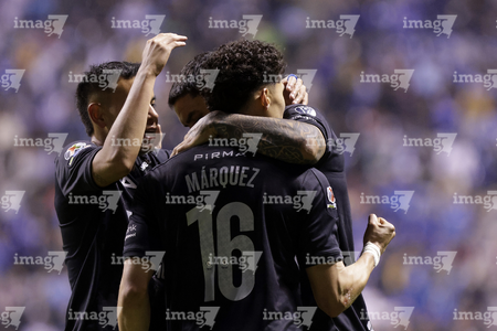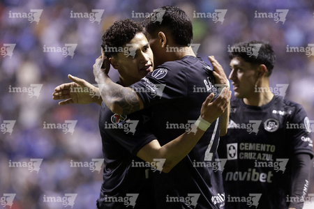 Puebla, Puebla, 31 de octubre de 2025. Carlos Rodríguez y Jeremy Marquez en festejo de gol, durante el partido correspondiente a la jornada 16 del torneo Apertura 2025 de la Liga BBVA MX, entre el Club Puebla y la Máquina Celeste del Cruz Azul, realizado en el estadio Cuauhtémoc. Foto: Imago7/ Mireya Novo