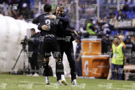 Puebla, Puebla, 31 de octubre de 2025. Omar Campos y Nicolás Larcamón en festejo de gol, durante el partido correspondiente a la jornada 16 del torneo Apertura 2025 de la Liga BBVA MX, entre el Club Puebla y la Máquina Celeste del Cruz Azul, realizado en el estadio Cuauhtémoc. Foto: Imago7/ Mireya Novo