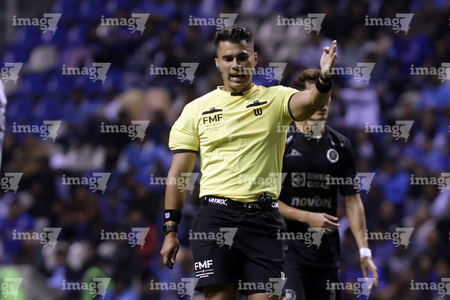 Puebla, Puebla, 31 de octubre de 2025. Guillermo Pacheco Larios, árbitro central, durante el partido correspondiente a la jornada 16 del torneo Apertura 2025 de la Liga BBVA MX, entre el Club Puebla y la Máquina Celeste del Cruz Azul, realizado en el estadio Cuauhtémoc. Foto: Imago7/ Mireya Novo