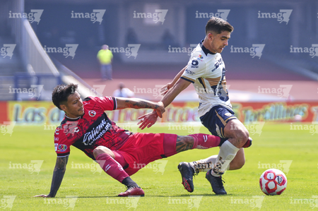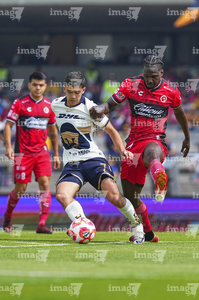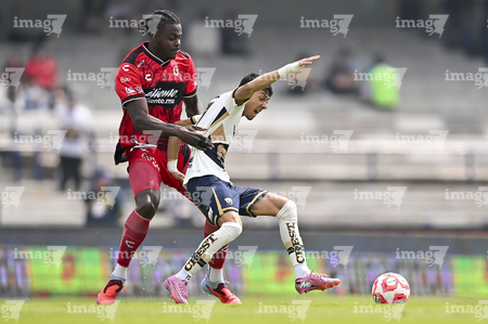 Ciudad de México, 2 de noviembre de 2025. Alan Medina y Iván Tona, durante el partido correspondiente a la jornada 16 del torneo Apertura 2025 de la Liga BBVA MX, entre los Pumas de la UNAM y los Xolos de Tijuana, realizado en el estadio Olímpico Universitario. Foto: Imago7/ Manlio Contreras