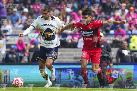 Ciudad de México, 2 de noviembre de 2025. Rodrigo López y Jackson Porozo, durante el partido correspondiente a la jornada 16 del torneo Apertura 2025 de la Liga BBVA MX, entre los Pumas de la UNAM y los Xolos de Tijuana, realizado en el estadio Olímpico Universitario. Foto: Imago7/ Manlio Contreras