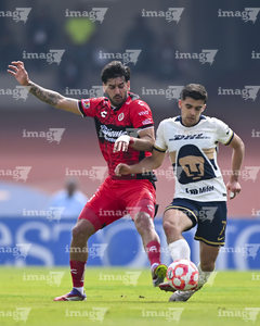 Ciudad de México, 2 de noviembre de 2025. Domingo Blanco y Rodrigo López, durante el partido correspondiente a la jornada 16 del torneo Apertura 2025 de la Liga BBVA MX, entre los Pumas de la UNAM y los Xolos de Tijuana, realizado en el estadio Olímpico Universitario. Foto: Imago7/ Carlos Vargas