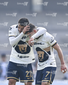 Ciudad de México, 2 de noviembre de 2025. Jesús Gómez y Rodrigo López, durante el partido correspondiente a la jornada 16 del torneo Apertura 2025 de la Liga BBVA MX, entre los Pumas de la UNAM y los Xolos de Tijuana, realizado en el estadio Olímpico Universitario. Foto: Imago7/ Etzel Espinosa