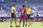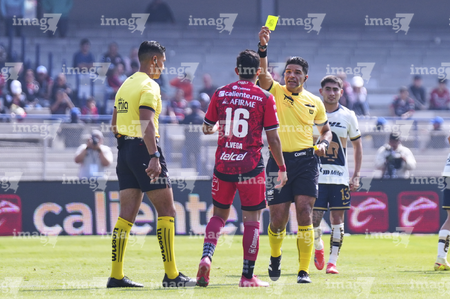 Ciudad de México, 2 de noviembre de 2025. Maximiliano Quintero Hernández, árbitro central muestra tarjeta amarilla de amonestación a Jesús Vega, durante el partido correspondiente a la jornada 16 del torneo Apertura 2025 de la Liga BBVA MX, entre los Pumas de la UNAM y los Xolos de Tijuana, realizado en el estadio Olímpico Universitario. Foto: Imago7/ Carlos Vargas